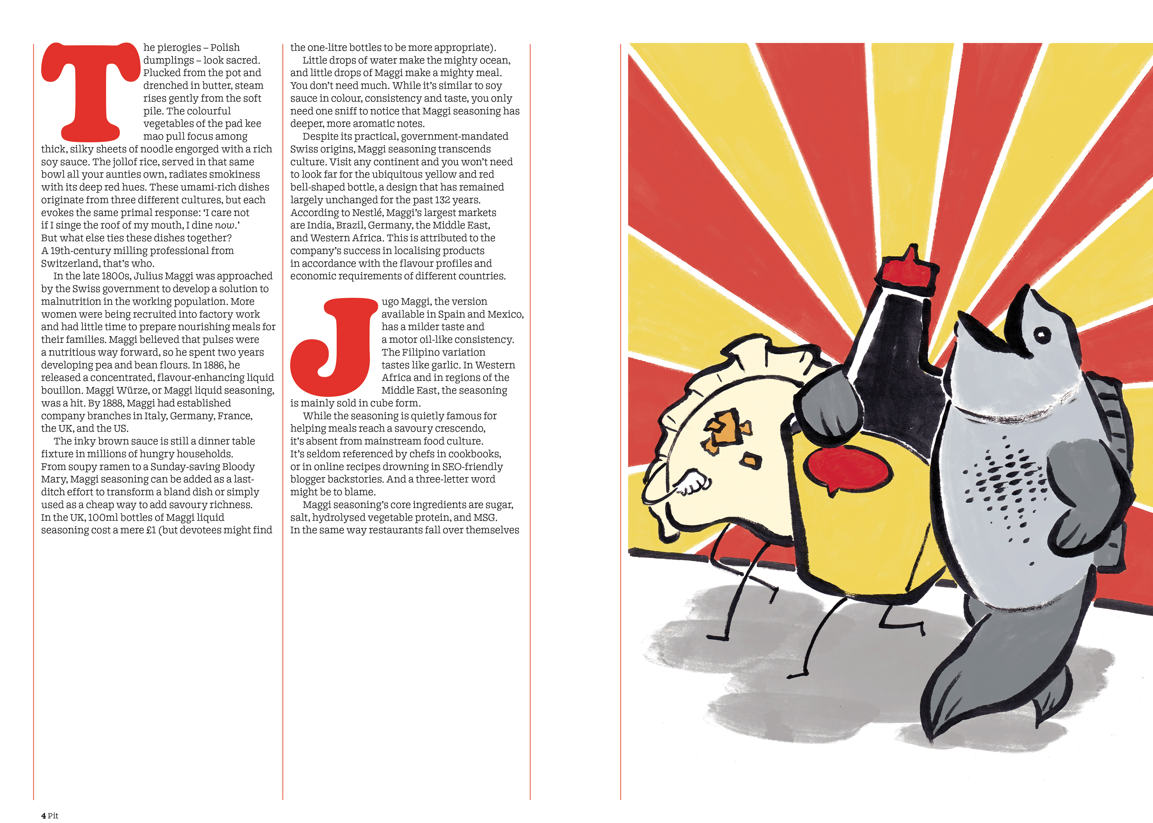 A bunch of different food and ingredients following a cheerful Maggi bottle. This shows the popularity and versatality of the Maggi seasoning, an "everything" sauce which can be paired with...everything.